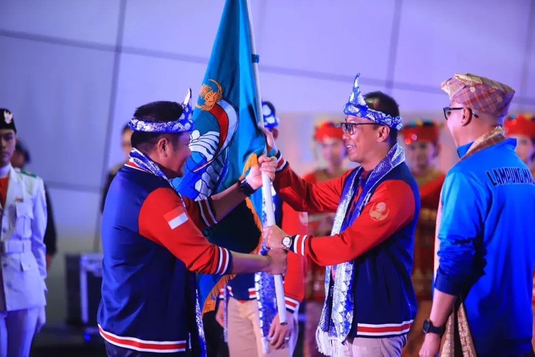 Gubernur Lampung, Rahmat Mirzani Djausal, S.T., M.M yang hadir bersama Forkopimda lainnya, secara resmi menerima tongkat estafet dan menyatakan kesiapan daerahnya untuk menjadi tuan rumah Pornas KORPRI berikutnya pada Tahun 2027